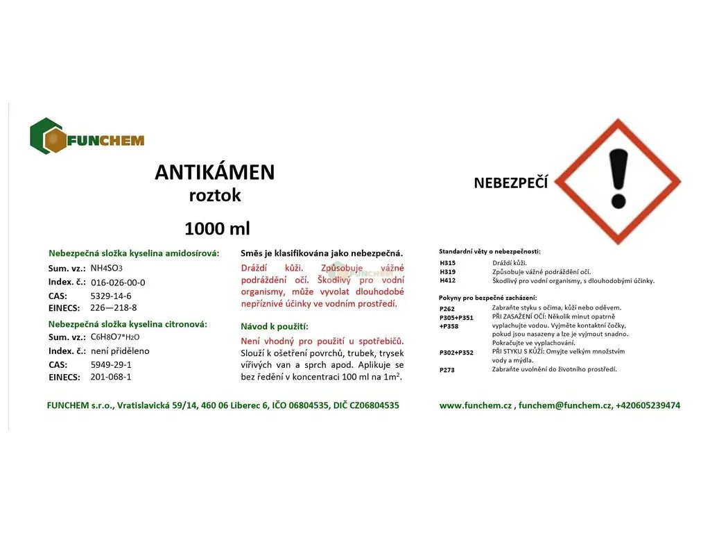 Antikámen - odstraňovač vodního kamene je kyselá směs, vhodná k odstraňování silných vrstev vodního kamene (uhličitanu vápenatého) a rzí v domácnostech. Výborně odstraňuje vodní kámen ze smaltovaných povrchů, keramických povrchů a dlaždic. Tento Antikámen není vhodný pro odstraňování kamene z praček, myček nádobí a rychlovarných konvic. Pro tento účel byl vyvinut prostředek Antikámen Kitchen.