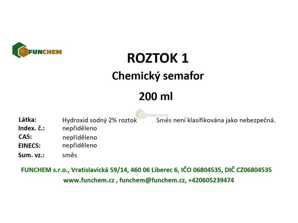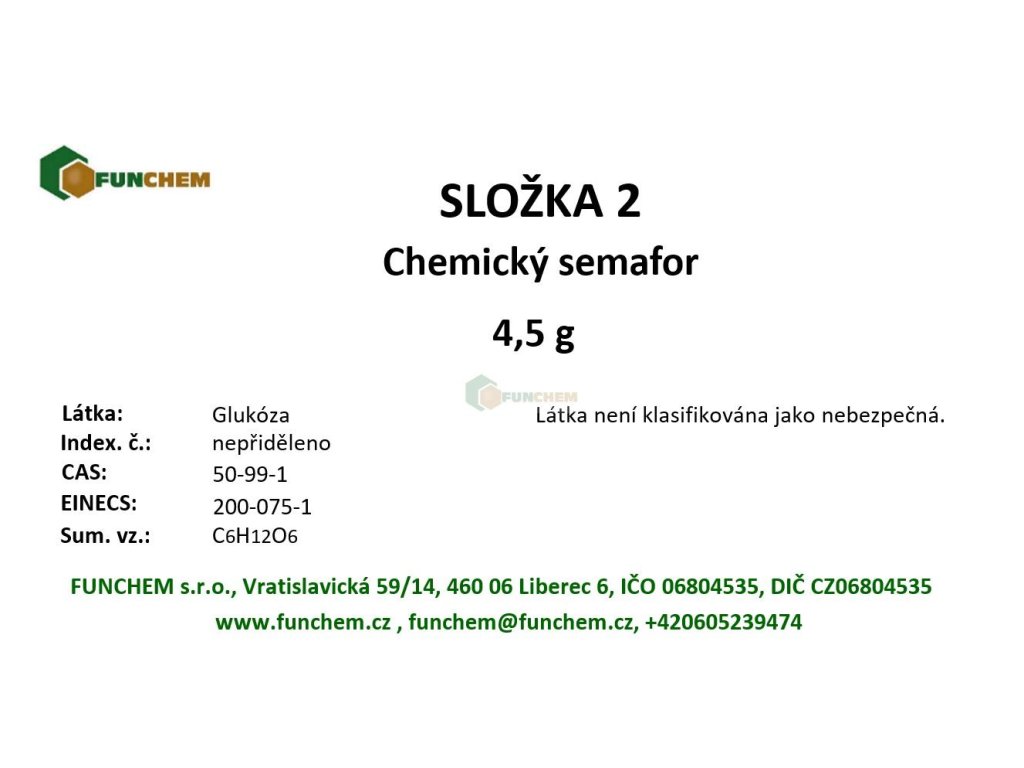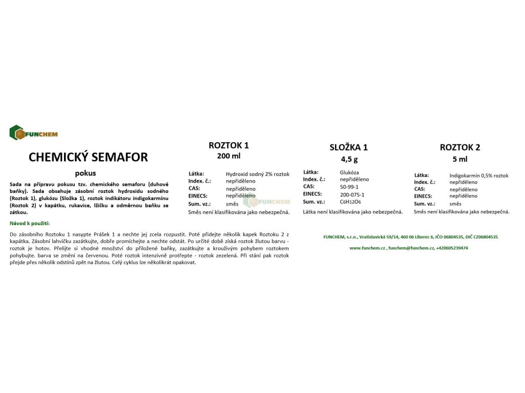 Sada na přípravu pokusu tzv. chemického semaforu (také někdy nazýván jako duhová baňka). Sada obsahuje zásobní roztok hydroxidu sodného (Roztok 1, z bezpečnostních důvodů dodáváme již namíchaný), glukózu (Složka 1), roztok indikátoru indigokarmínu (Roztok 2) v kapátku, rukavice a lžičku .