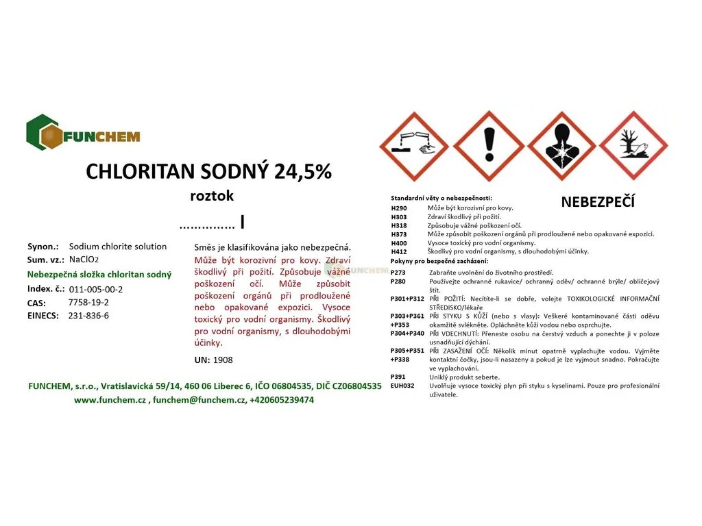 Chloritan sodný 24,5 % je vynikající dezinfekce do bazénu, nebo na vytírání podlah. Skvěle likviduje viry a bakterie už v malých koncentracích.