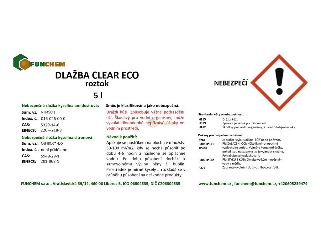 Čistící prostředek Dlažba Clear ECO byl vyvinut k čištění betonových, žulových a keramických dlažebních segmentů používaných v exteriéru. Prostředek odstraňuje běžné nečistoty vzniklé denním používáním, tj tmavé zašlapané a zaježděné fleky, fleky od listí, trávy, odstraňuje mírné nánosy rzí a olejů, a navrací dlaždicím jejich původní barvu a vzhled. Prostředek dále ničí mechy ve spárách, odstraňuje řasu v a na dlaždicích a ničí malé rostlinstvo vegetující ve spárách. Prostředek je biologicky zcela odbouratelný a po dokonalém oplachu nezanechává další stopy na dlažbě.