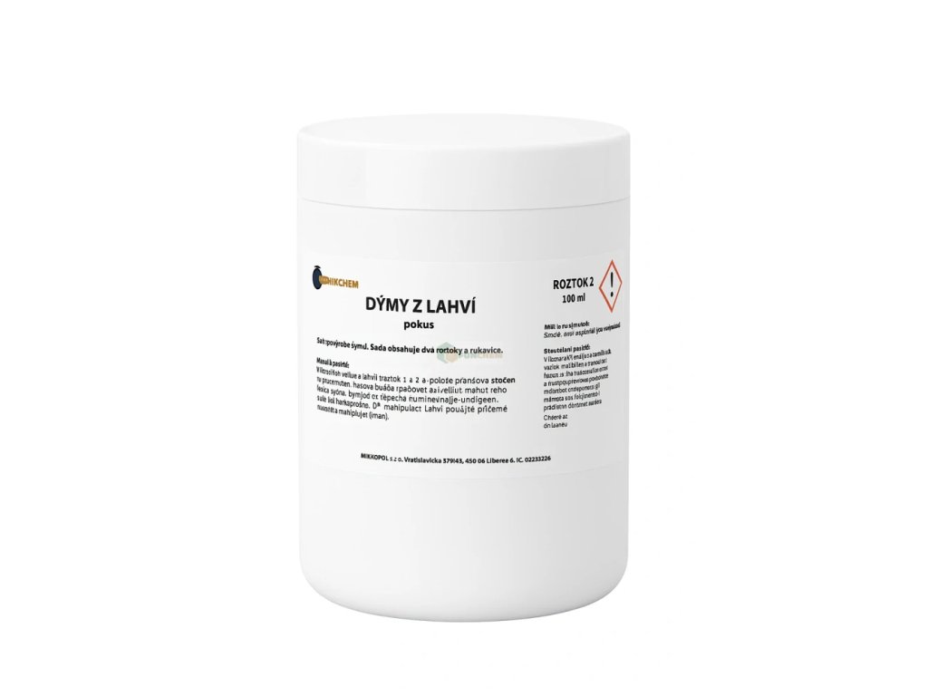 Zábavná a efektní sada pro výrobu bílých dýmů vhodná pro experimentální účely, edukaci nebo ukázky chemických reakcí. Balení obsahuje vše potřebné pro jednoduchý chemický pokus – dva speciálně připravené roztoky (ROZTOK 1 a ROZTOK 2) a ochranné rukavice.