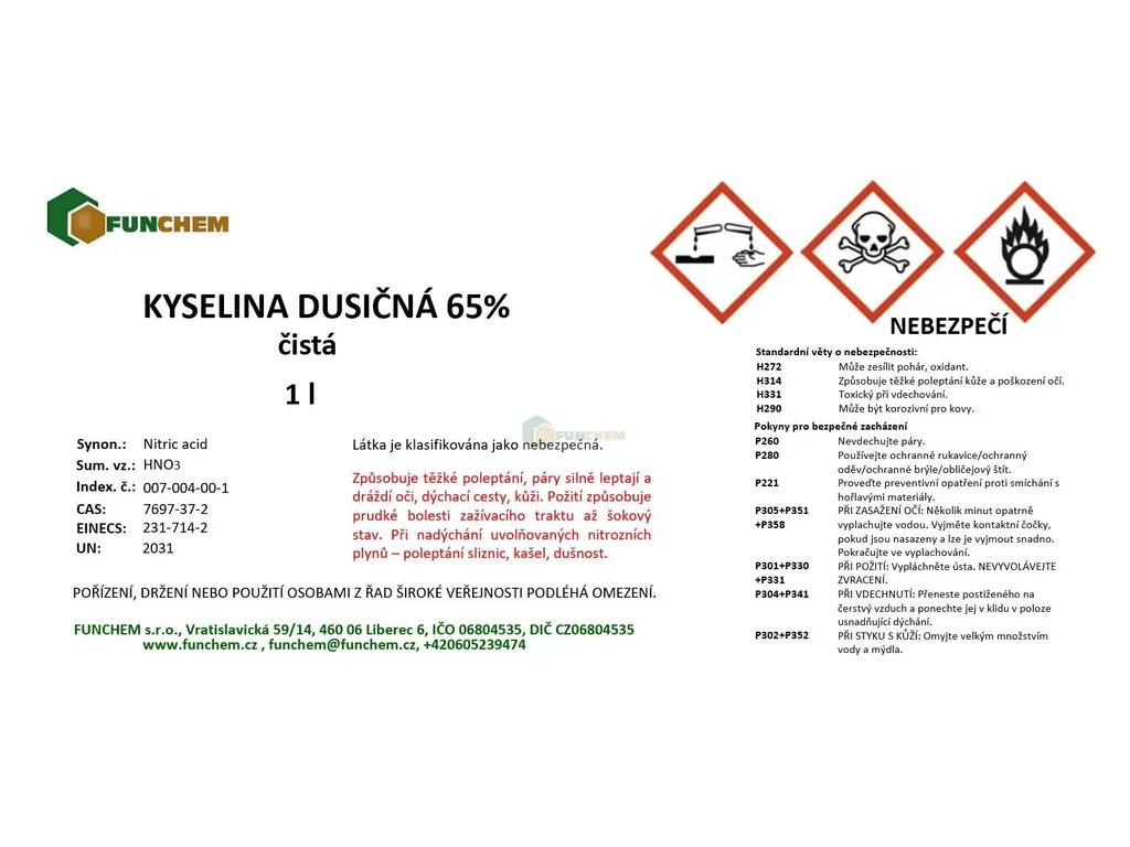 Kyselina dusičná 65% je silně oxidační kyselina používaná pro odmořování kovů, k čištění potrubních systémů, k nitracím a jiným syntézám. V povrchových úpravách se používá např. pro stripování niklových vrstev.