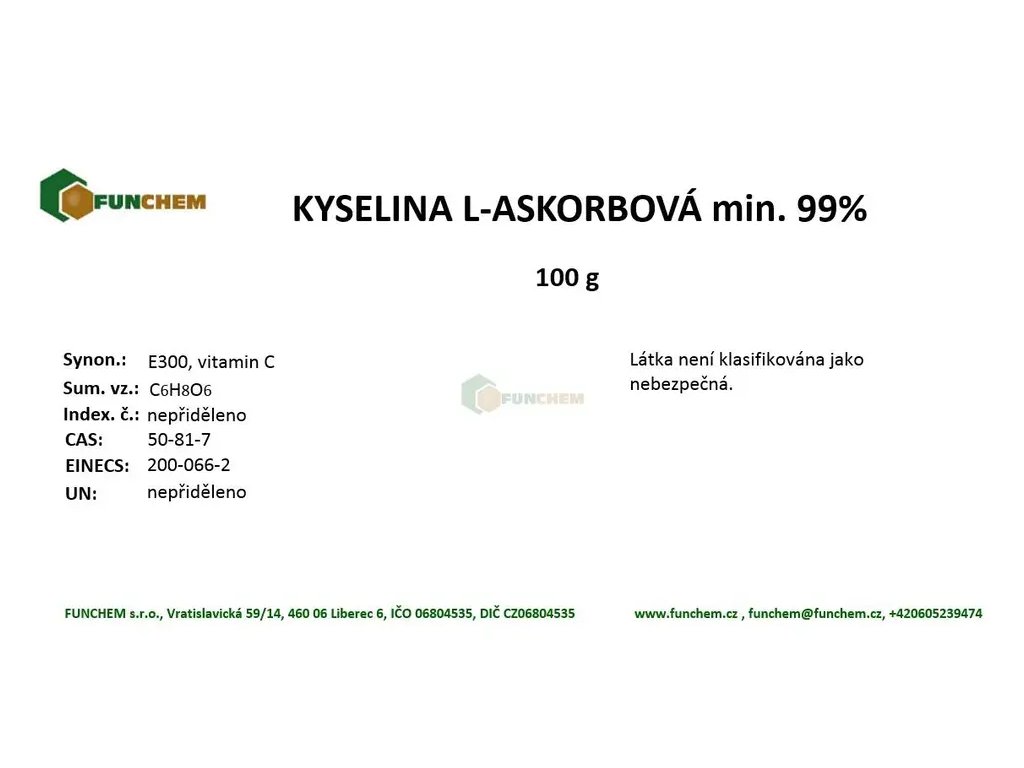 Kyselina L - askorbová 99,9% , neboli vitamín C, resp. E300 má díky svým vlastnostem (vitamin, antioxidant a chelatační činidlo) široké použití jako potravinářské aditivum především v konzervárenské a kvasné technologii. Jako antioxidant se využívá jako antioxidant např. v ovocných džusech nebo v pekárenském či masném průmyslu, kde snižuje oxidaci tuků a tím brání vzniku rakovinotvorných látek.