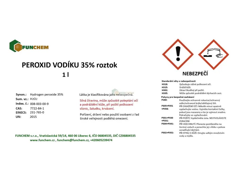 Peroxid vodíku max. 35% OMEZENÍ zakoupíte online na , specializovaném e‑shopu s chemikáliemi pro laboratorní, průmyslové i domácí použití.