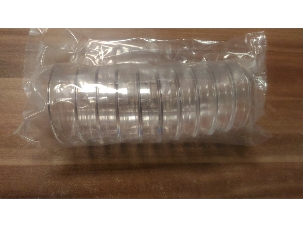 Nesterilní petriho misky z polystyrenu, průměr 60 mm, výška 8 mm, balení 10 ks. Výrobce Gama, a.s., ČR.