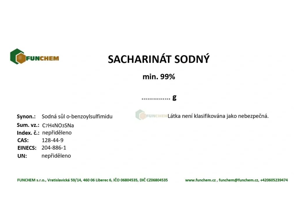 Sacharin(át) sodný neboli sodná sůl o - benzoylsulfimidu ve farmaceutické kvalitě, výrobce Carl Roth. Používá se jako aditivum do galvanických lázní, v potravinářství jako umělé sladidlo.