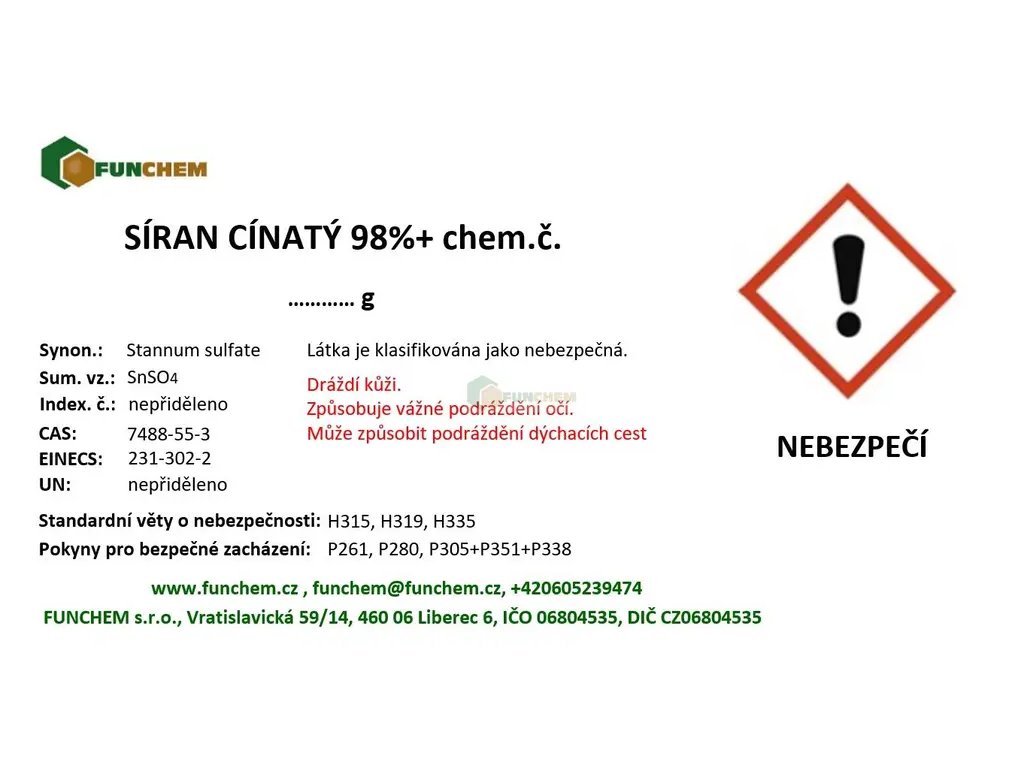 Síran cínatý p.a. 100 g zakoupíte online na , specializovaném e‑shopu s chemikáliemi pro laboratorní, průmyslové i domácí použití.